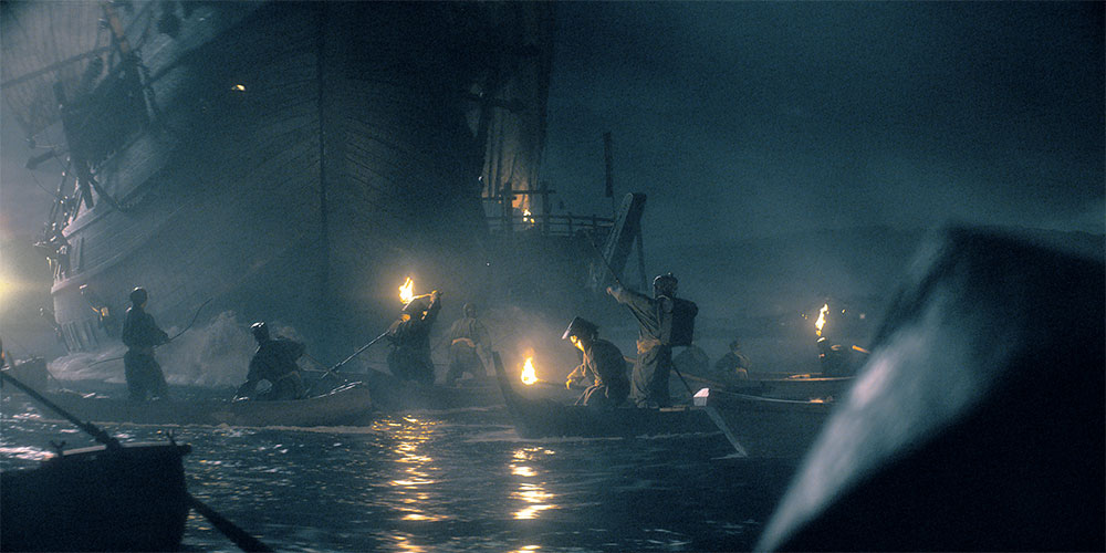 In Episode 3, the ship race out of Osaka was their largest, most complex sequence. “This sequence alone encompassed several hundred VFX shots. The ships were completed as one-quarter practical builds and positioned side-by-side in a car park in front of a blue screen. One of these quarter-builds was placed on a track so that we could move the ships relative to each other, creating a jostling effect in camera. But we were nowhere near any water, and had no Osaka in the background. We scanned all of the main cast and built digital doubles of them to populate the ship decks as they sail past camera.Wider shots of groups of ships were almost always full CG. ”