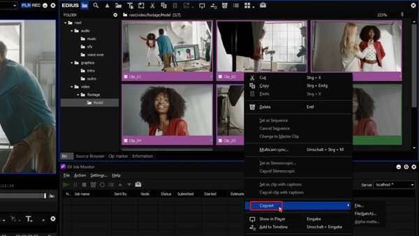 Even in earlier EDIUS versions, waveform cache files and proxy files (sidecar files) were rendered in the background. These files are now generated by the new background render engine in the same way as the export, conversion and render jobs. Waveform cache files are created along with clip properties, and proxy files are created automatically when the proxy mode starts and encoded in H.264. H.265 files would be smaller but the format is too demanding on resources and slow to encode/decode.