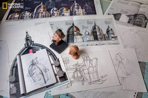 To make the animation, hundreds of frames were drawn. This segment, which shows Il Duomo architect Brunelleschi walking, featured more than 100 frames. Art: Fernando G. Baptista, NGM Staff |